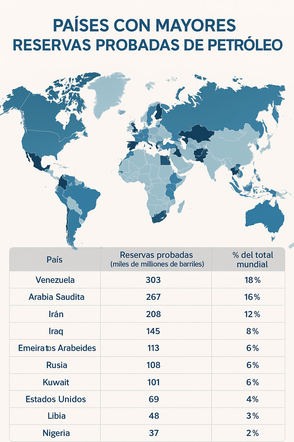| País | Reservas probadas (miles de millones de barriles) | % del total mundial |