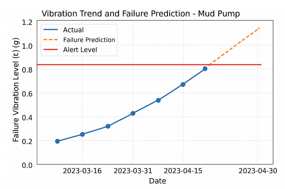 En una operación de perforación terrestre en el sur de México, se integró un sistema de mantenimiento predictivo en la bomba de lodo principal (triplex). El procedimiento incluyó: